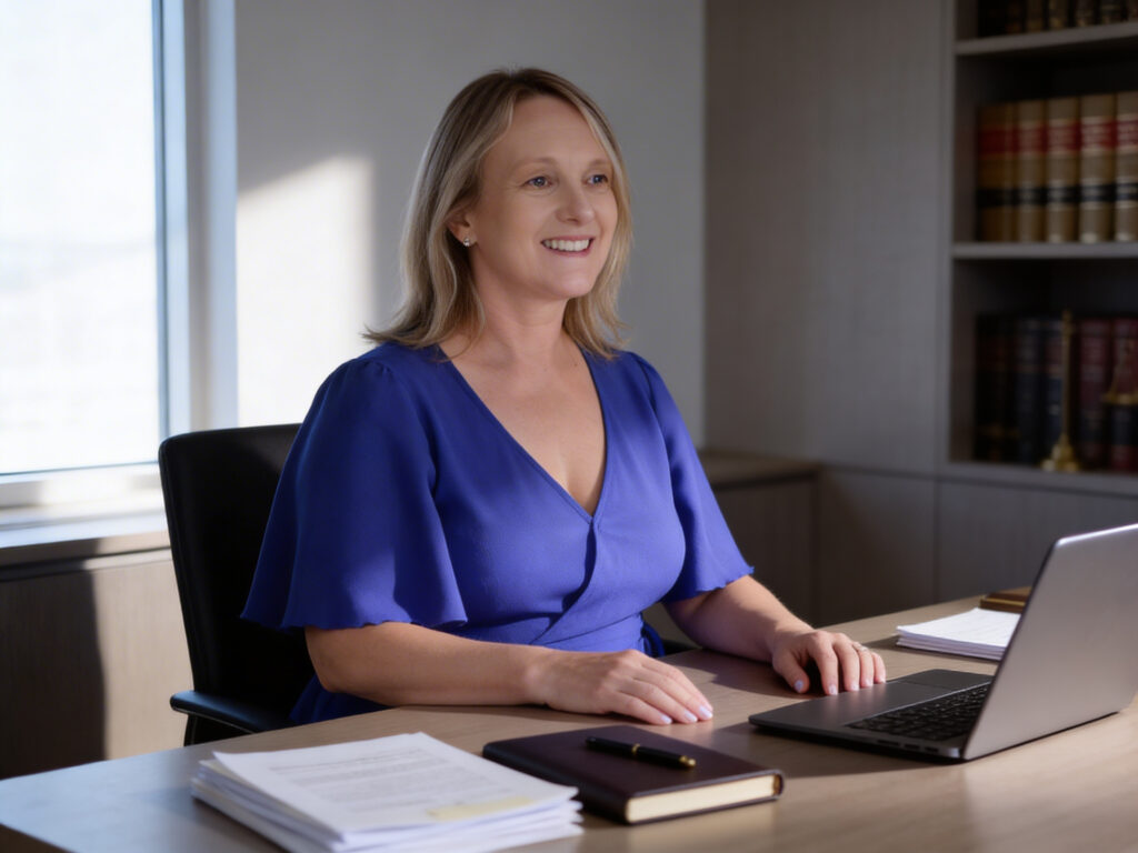 Mulher profissional sentada em escritório, sorrindo enquanto utiliza um notebook sobre a mesa, com documentos organizados e estante de livros ao fundo, em ambiente corporativo iluminado por luz natural.